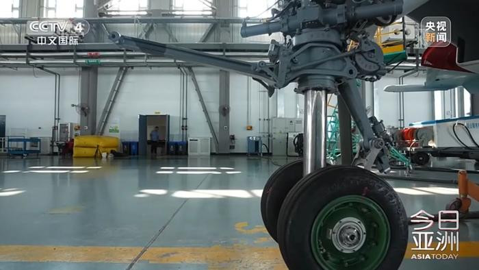 因为飞机的姿态是这样的,等到尾钩一挂上,前起落架就会砸到甲板上。这个一是对它强度的考验;第二个,对前起落架吸能也是一个重要的技术难点。你可以看到起落架非常粗,我国工业水平整体也在进步,未来我们希望它结构要细一点、轻一点,飞机越轻,空中的性能越好。